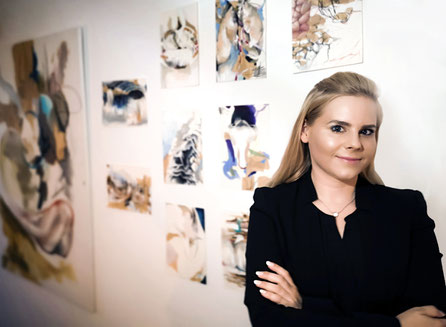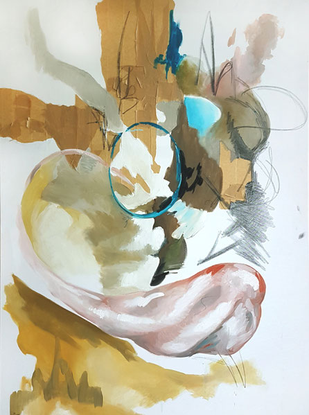 Durch Ölfarbe, Kreide, Graphit und Klebeband werden verschiedene Ebenen erzeugt und flächige Formen und Tiefenwirkungen harmonieren miteinander. Elektronenmikroskopien und EEGs dienen unter anderem als Inspiration und werden zum Teil der Bilder. Undurchblutete, farblose Ober- und Unterlippen werden beispielsweise durch einen Ausschnitt eines EEGs von einander getrennt. Vereinzelte Formen lassen den Betrachter weitere individuelle Bezüge setzen und geben Spielraum für neue Assoziationen.